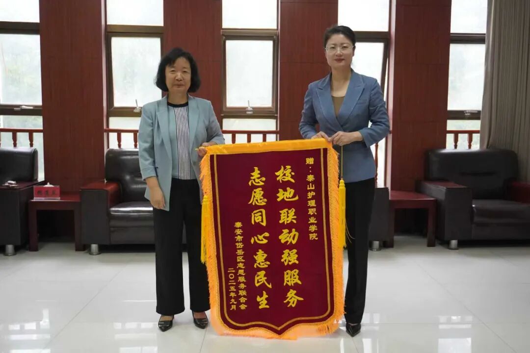 9月23日,岱岳区委社会工作部部长、区委“两新”工委书记赵娜一行到访学院并赠送锦旗,以此感谢我院志愿者在2025年全国竞走锦标赛中展现出的无私奉献精神与暖心服务态度。学院党委书记杨建全、副院长李红伟参加活动。