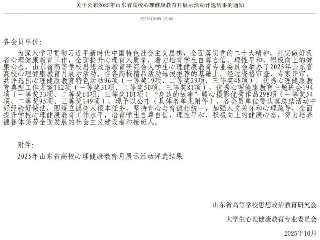 近日,2025年山东省高校心理健康教育月展示活动评选结果出炉。学院积极组织参与,凭借扎实的心理健康教育工作成果与优质的报送项目,最终荣获二等奖4项、三等奖2项,在本次省级评选中交出亮眼答卷。