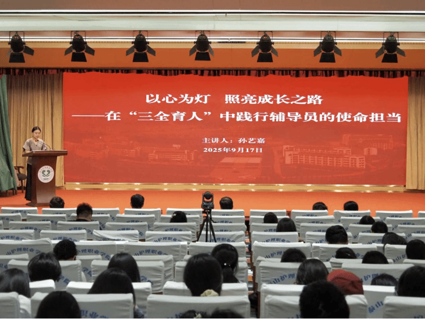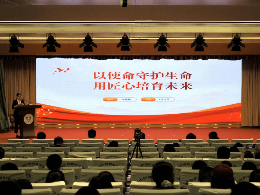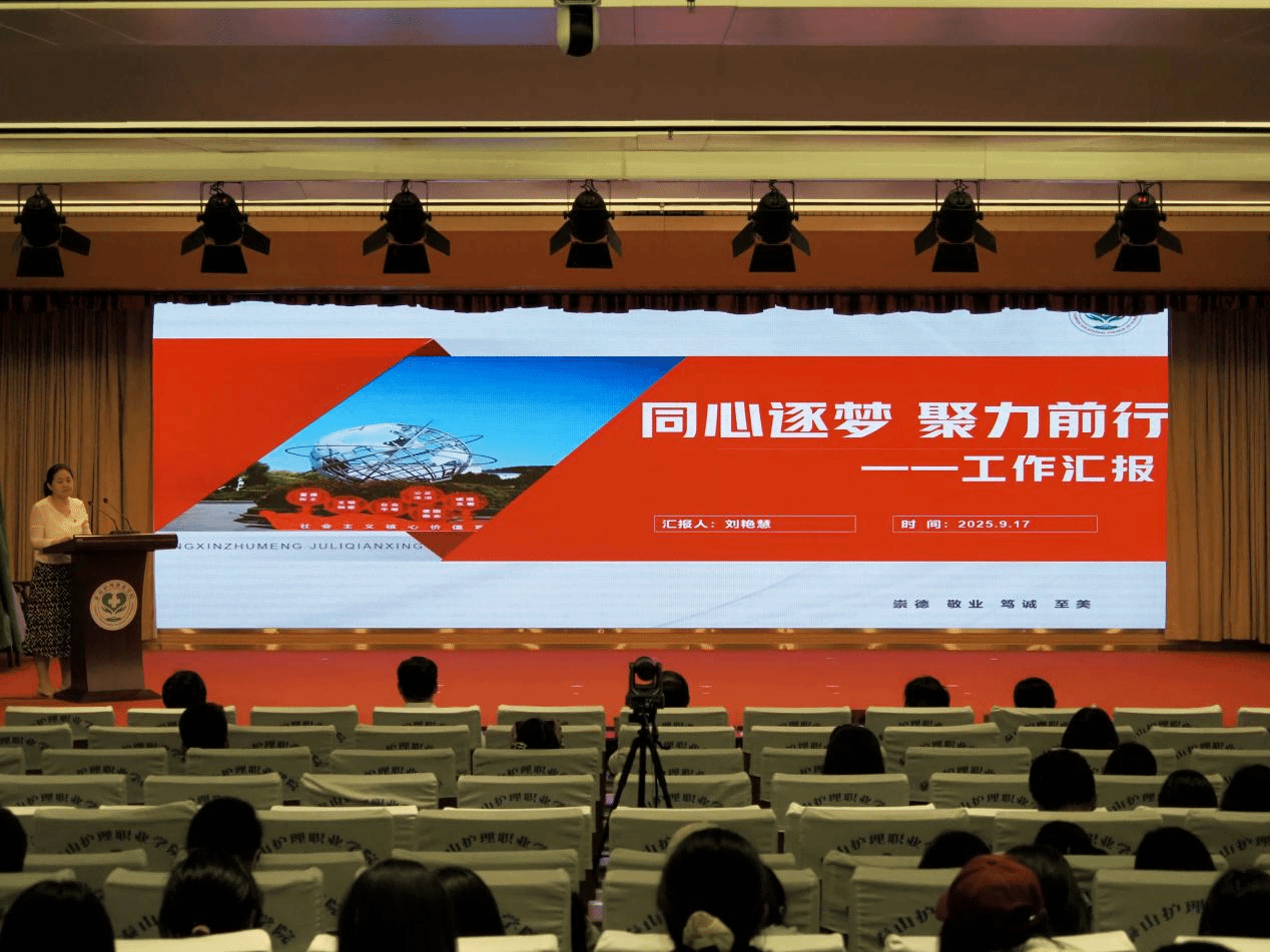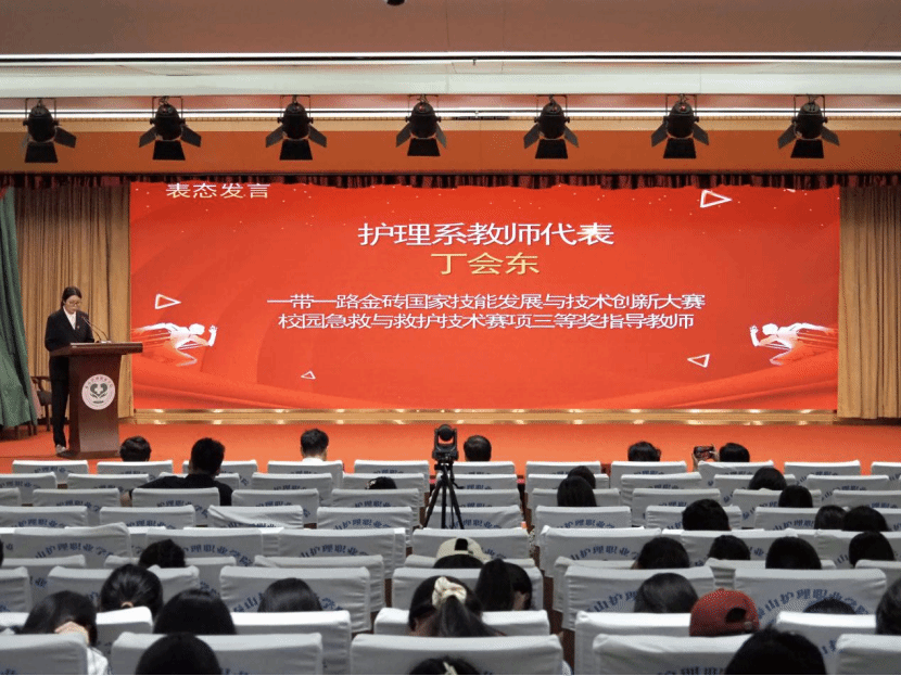 在事迹报告环节,四位优秀教师代表依次上台,分享了她们扎根教坛、潜心育人的动人故事。2025年世界技能大赛养老赛道铜牌获得者刘艳慧以《同心逐梦,聚力前行》为题,讲述了带领学生拼搏技能赛场的心路历程;第十七届山东省职业院校技能大赛二等奖指导教师范树腾通过《以专业传递温度,用匠心守护夕阳》,展现了将人文关怀融入专业教学的实践;三等奖指导教师李腾腾通过《以使命守护生命,用匠心培育未来》分享了作为学生良师益友的感悟;辅导员孙艺嘉则以《以心为灯,照亮成长之路》为题,深情讲述了在“三全育人”中守护学生成长的担当。