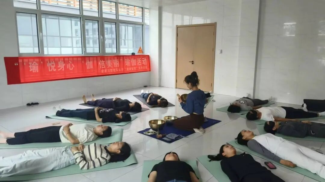 老师逐一体式拆解发力点,及时纠正大家的姿势偏差。细致的指导让初次接触瑜伽的同学也快速找到节奏,原本紧绷的腰背渐渐舒展,脸上的疲惫也随之消散。最令人沉醉的当属收尾的颂钵疗愈环节。当铜钵被轻轻敲击,低沉悠远的共振声便在空间中弥漫,同学们闭眼平卧,感受音波穿透身体的震颤。
